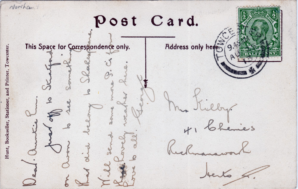 Postcard post marked 25 August 1913 and produced by Hunt, Stationer, and Printer, Towcester